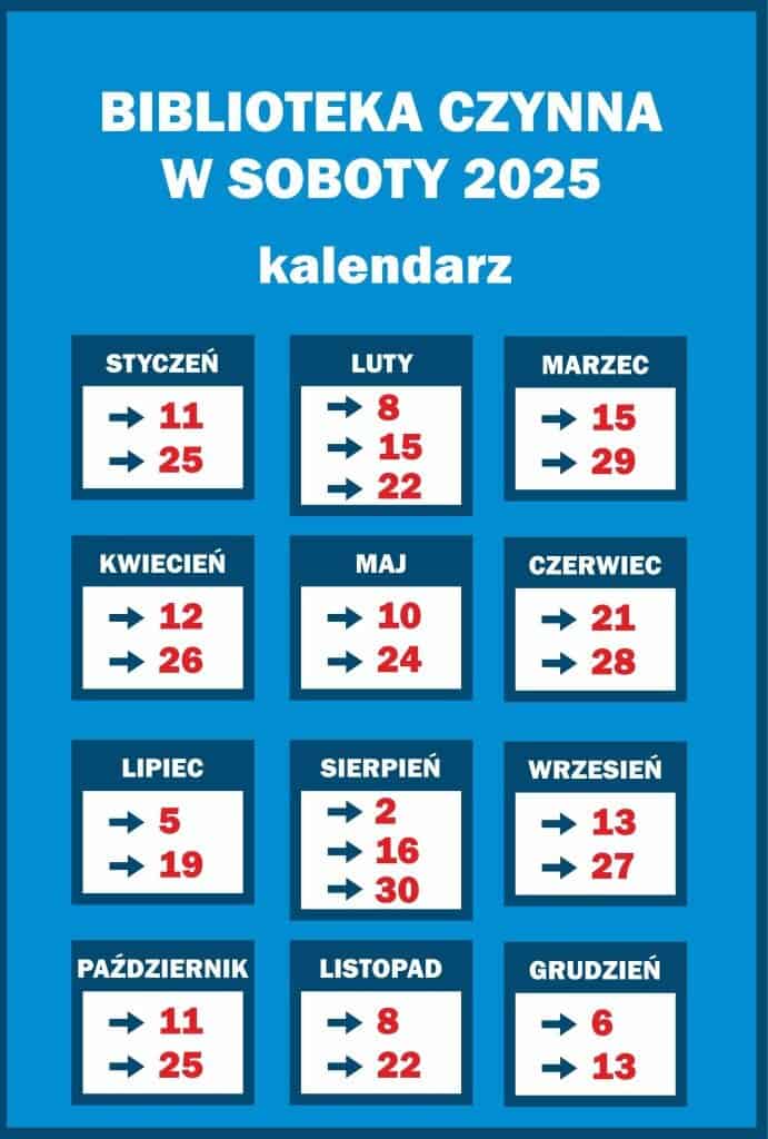 Drodzy Czytelnicy, informujemy, że będziemy otwarci w dwie soboty każdego miesiąca (a czasem nawet w trzy), w godz.: 8.00-15.00 przez cały rok 2025 ![]()