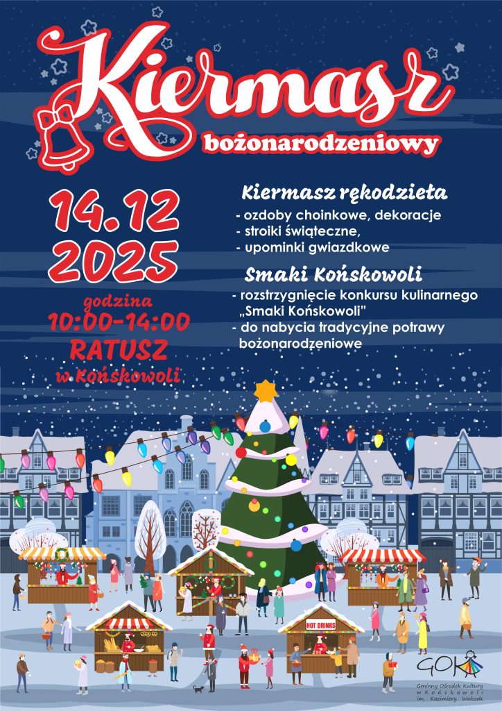 Zapraszamy lokalnych twórców, artystów i pasjonatów rękodzieła z gminy Końskowola do udziału w Kiermaszu bożonarodzeniowym, który odbędzie się 14 grudnia 2025 w godz. 10.00 – 14.00. Jak co roku spotykamy się w przestrzeniach końskowolskiego Ratusza aby zaprezentować swoje unikalne prace mieszkańcom i gościom, promować lokalną twórczość oraz sprzedawać swoje produkty w wyjątkowej, świątecznej atmosferze.