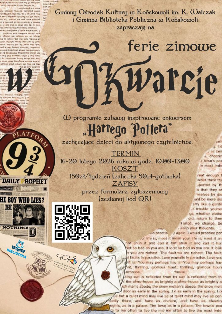 Jak co roku zapraszamy dzieci od 7 roku życia do wspólnego spędzenia czasu w ferie zimowe. Tym razem inspiracji do zabaw poszukamy w książkach z uniwersum Harrego Pottera. Uczestnicy wezmą udział w lekcjach opieki nad magicznymi stworzeniami, tworzenia eliksirów oraz obrony przed czarną magią. Będą pracować indywidualnie i grupowo a zdecyduje o tym tiara przydziału.