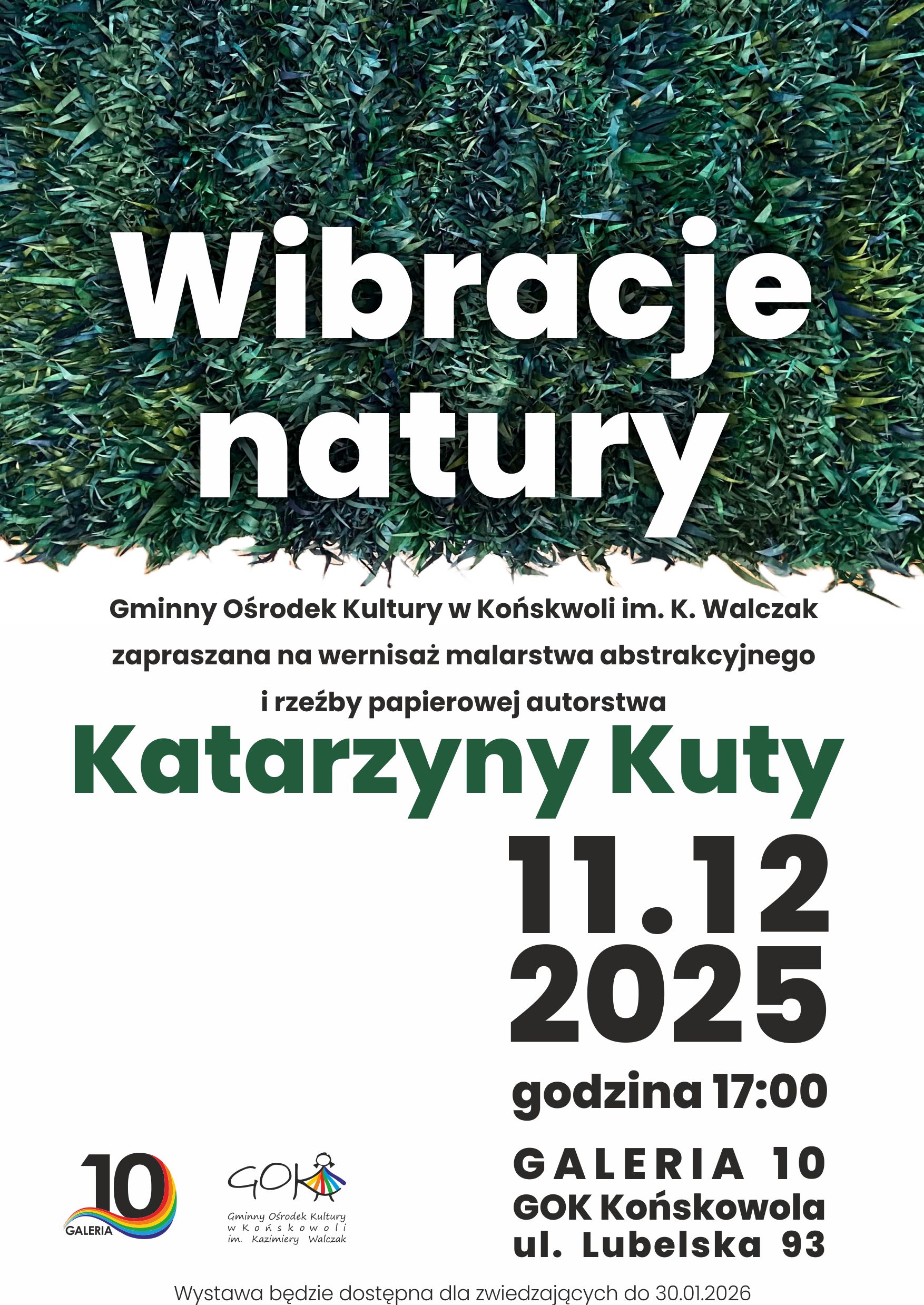 Wystawa malarstwa abstrakcyjnego i rzeźby papierowej „Wibracje natury” to artystyczna opowieść o głębokiej więzi z naturą ,zrodzoną w dzieciństwie, pielęgnowaną przez lata, i wciąż żywo obecna w moim codziennym życiu. Las, który od zawsze mnie otaczał, stał się nie tylko tłem, ale i natchnieniem. Jego spokój, rytm, powolne zmiany i niewidoczne połączenia między formami życia ,wszystko to znalazło odzwierciedlenie w moich pracach. Na wystawie prezentuję rzeźby z papieru inspirowane organicznymi kształtami, barwami i strukturami natury. Nie przedstawiają one dosłownie leśnego krajobrazu, lecz oddają jego puls, energię, wewnętrzne napięcia i harmonię. Towarzyszą im, delikatne, kruche formy przywołujące na myśl mchy i porosty leśne. To hołd dla tego, co często niewidoczne, maleńkich światów żyjących w symbiozie, będących istotną częścią ekosystemu. Papier jako materiał pozwala uchwycić ulotność i subtelność tych form, a jednocześnie pokazuje ich wewnętrzną siłę i zdolność do przetrwania. W „Wibracjach natury” poszukuję punktu, w którym natura i człowiek nie są przeciwieństwami, lecz częścią wspólnego, pulsującego rytmu. To osobista podróż przez zmysły, pamięć i przestrzeń.